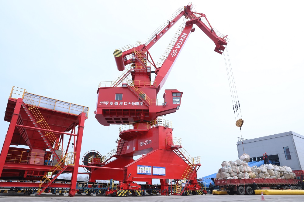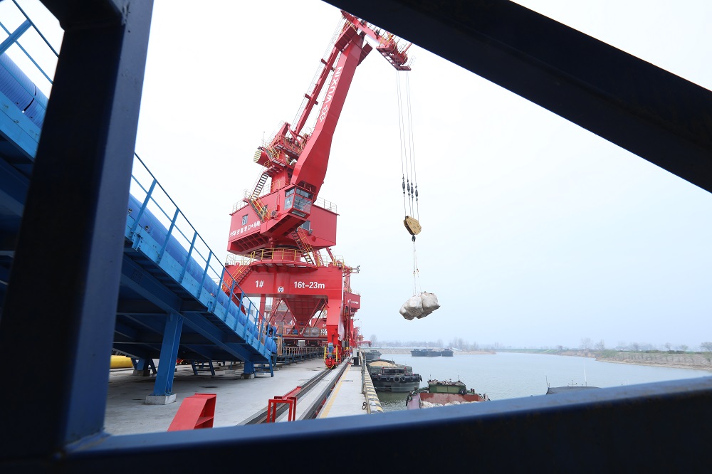 3月26日,記者來(lái)到淮北市濉溪縣孫疃港,現(xiàn)場(chǎng)起重機(jī)、多用途門機(jī)、移動(dòng)式裝船機(jī)屹立在澮河岸邊正在吊運(yùn)貨物,一派忙碌的景象。
