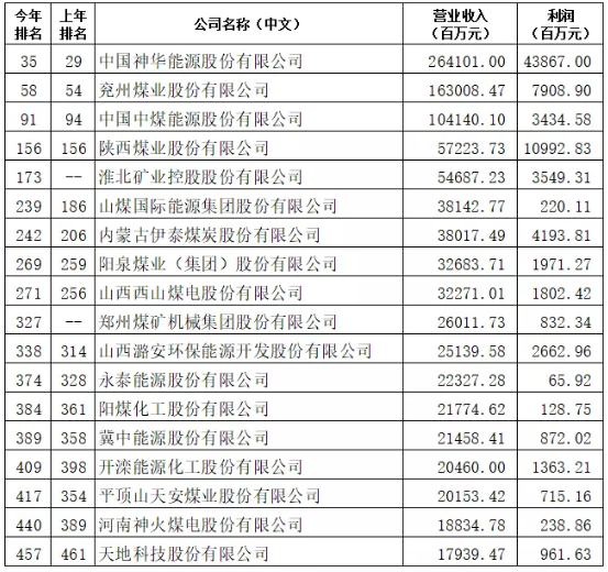 2019年7月10日,財富中文網發(fā)布了最新的《財富》中國500強排行榜。煤炭行業(yè)有18家公司入圍,分別為: